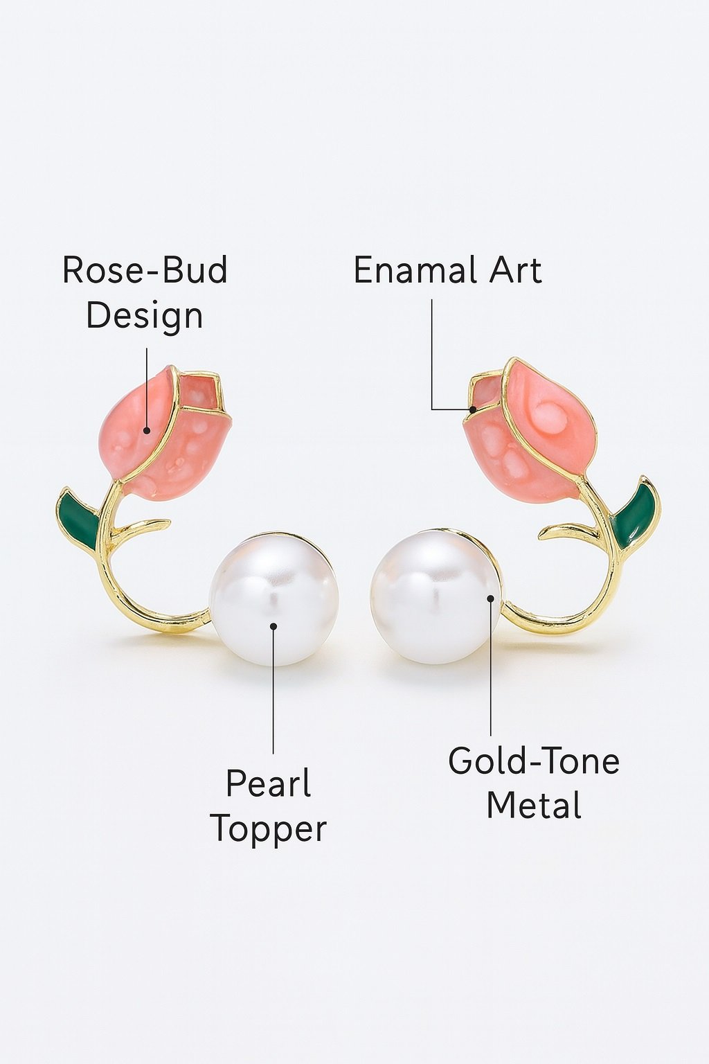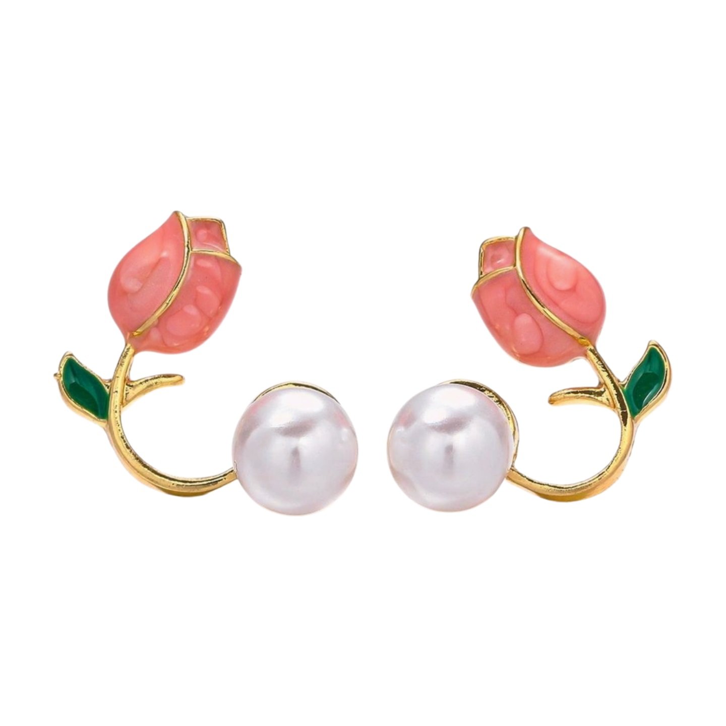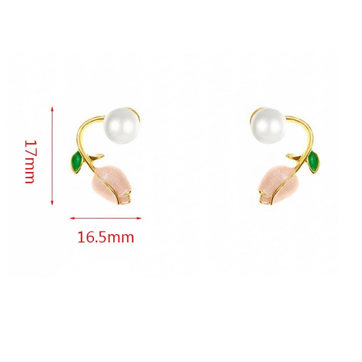 • PEARL EARRINGS:Our earrings are exquisitely designed and very creative. Below is a pearl earring and above it is a tulip wrapped around the bone of your ear. The branches of the tulip snake from behind your ear to the front. The tulip color is a soft lovely pink, by the mature gold connected to the beautiful round white pearls, the three as one, constitute a harmonious and perfect earring design.
